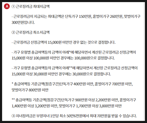 가구원 구성과 총급여액 등 (부부합산)에 따라 산정된 근로장려금을 지급하는 제도로 근로를 장려하고 소득을 지원하는 일과 연계된 복지제도 입니다.